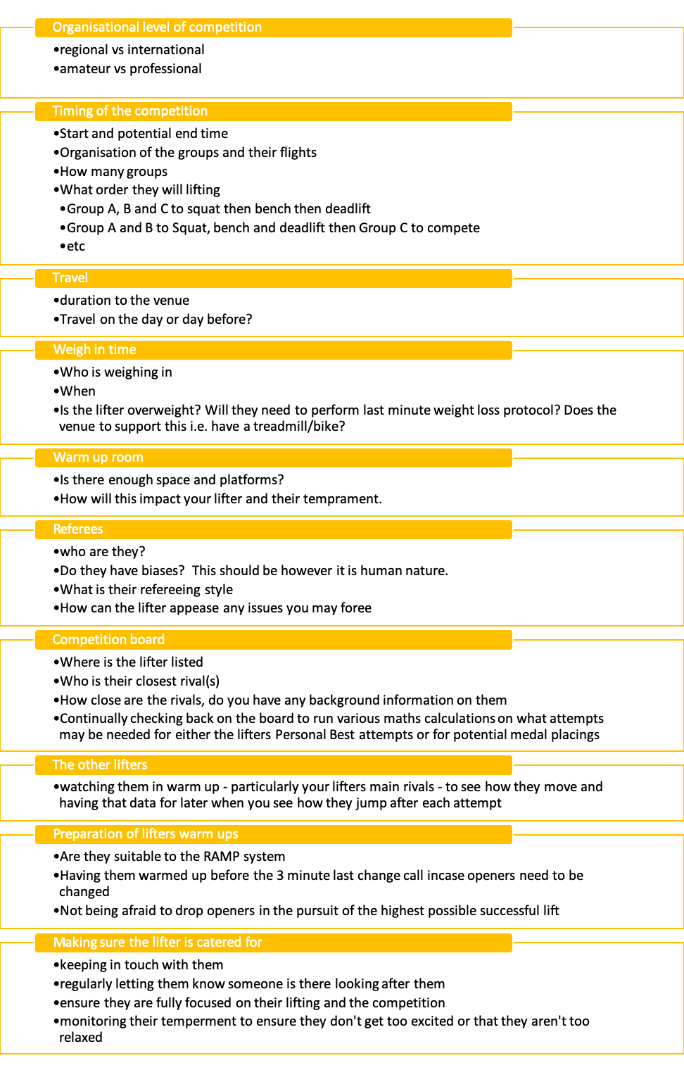 Once the lifter has prepared for the competition day, you have supported all of the necessary elements of the preparation phase it is essential that the competition day elements are considered.
