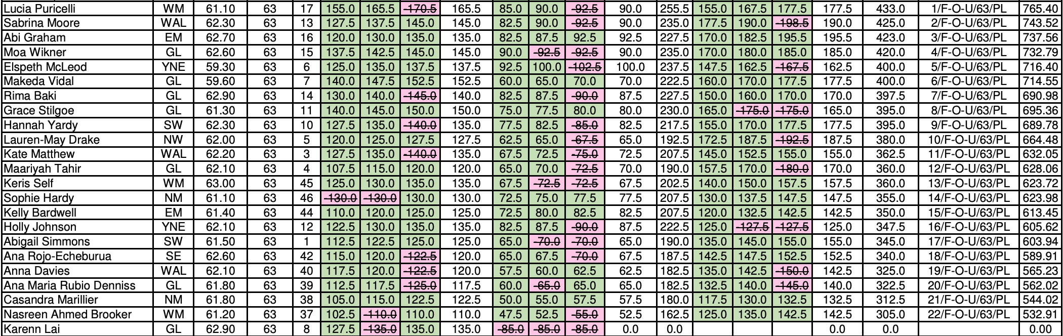 Focusing on the top two lifters, the sub-totals show that Puricelli was a comfortable 20kg ahead of Moore before the deadlift section, even though she lost out on 7.5kg by failling both her third attempts on squat and bench press. However, it is well known that Moore has an extremely good Deadlift, having previously achieved over 190kg, but is also recovering from a long term achilles injury. This is relevant to Puricelli’s coach as they will utilise this information by ensuring the attempt selections are within her capabilities and building the highest possible total to keep Moore in second place. Equally, Moore missed out on her third bench press as she jumped 7.5kg from first to second then only 2.5kg to her third. There could be an argument that had she only jumped 5k from first to second she would have retained a slight more energy ready for a 5kg jump to her third attempt. Without seeing the lift, it is hard to establish a correct procedure, however, analysing the results can show the budding coach how each lift can hugely impact the end result of the competition.