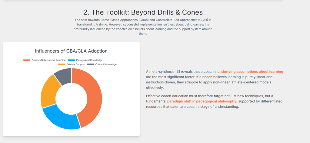 The application of learning science principles is increasingly central to modern coaching pedagogy. A meta-synthesis on Game-Based Approaches (GBAs) and Constraints-Led Approaches (CLAs) identified that coaches’ underlying assumptions about learning, their pedagogical knowledge, content knowledge, and the support they receive significantly influence their adoption and application of these innovative methods.3