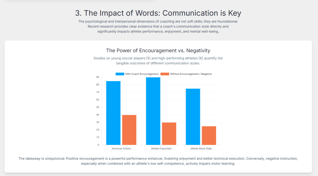 Thirdly, the psychological and interpersonal skills of coaches are increasingly recognized as paramount. Attributes such as multicultural humility, judicious decision-making, and even professional self-doubt are emerging as hallmarks of effective practitioners, challenging the notion of expertise as absolute certainty.4 The profound impact of coach communication on athlete enjoyment, mood, and particularly motor learning is unequivocally demonstrated.5 Negative communication, especially when coupled with low athlete self-competence, significantly impedes learning, while encouragement boosts both performance and intrinsic motivation. This reinforces the critical need for coaches to prioritize positive, constructive feedback and actively foster self-competence and mental well-being in their athletes.