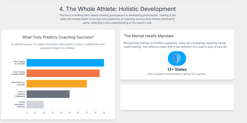 - Align Certification with Impact: Re-evaluate coach certification and licensure requirements to ensure they adequately reflect and incentivize training in critical areas such as life skills development and mental health support, which have been shown to directly impact athlete outcomes.7